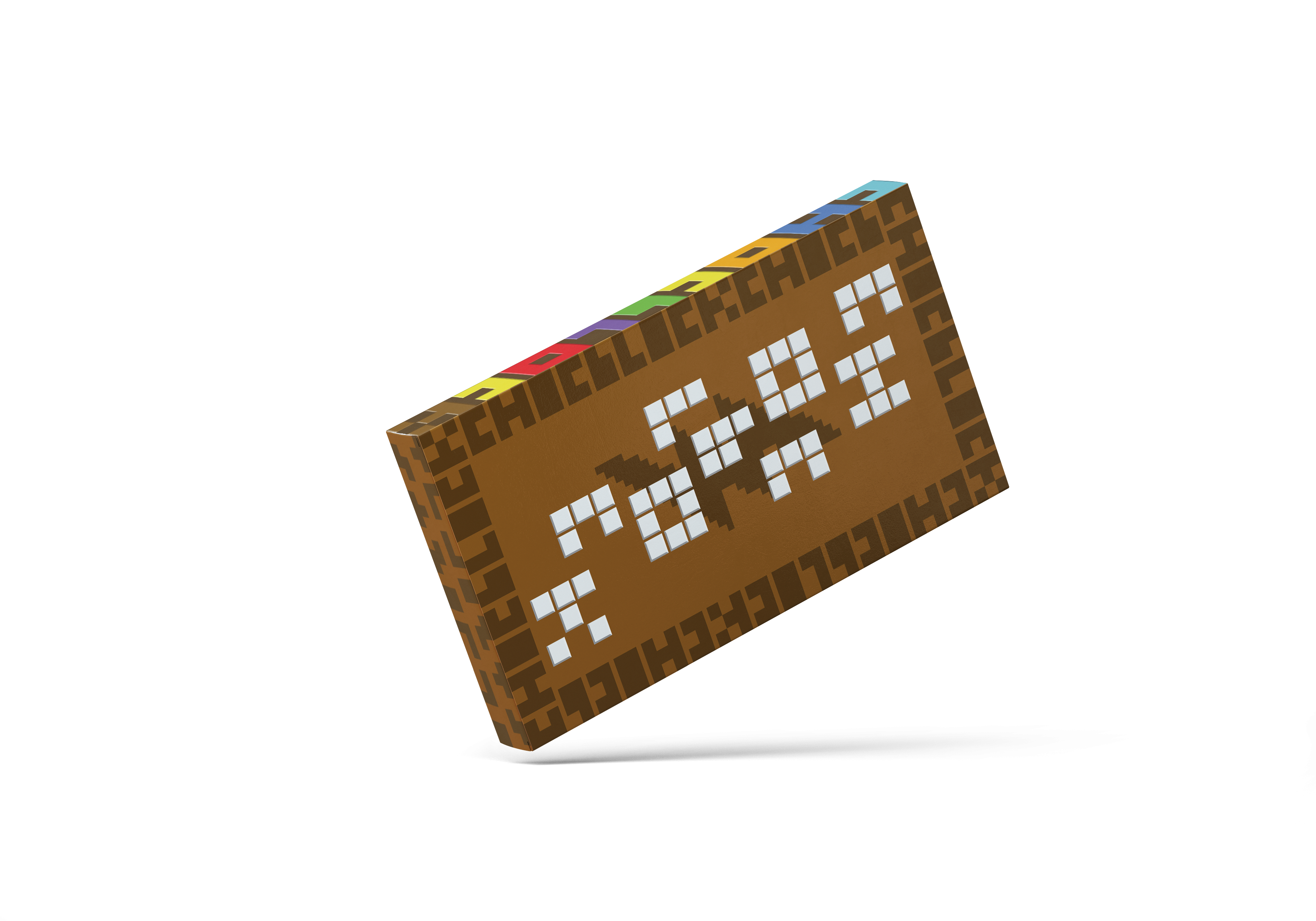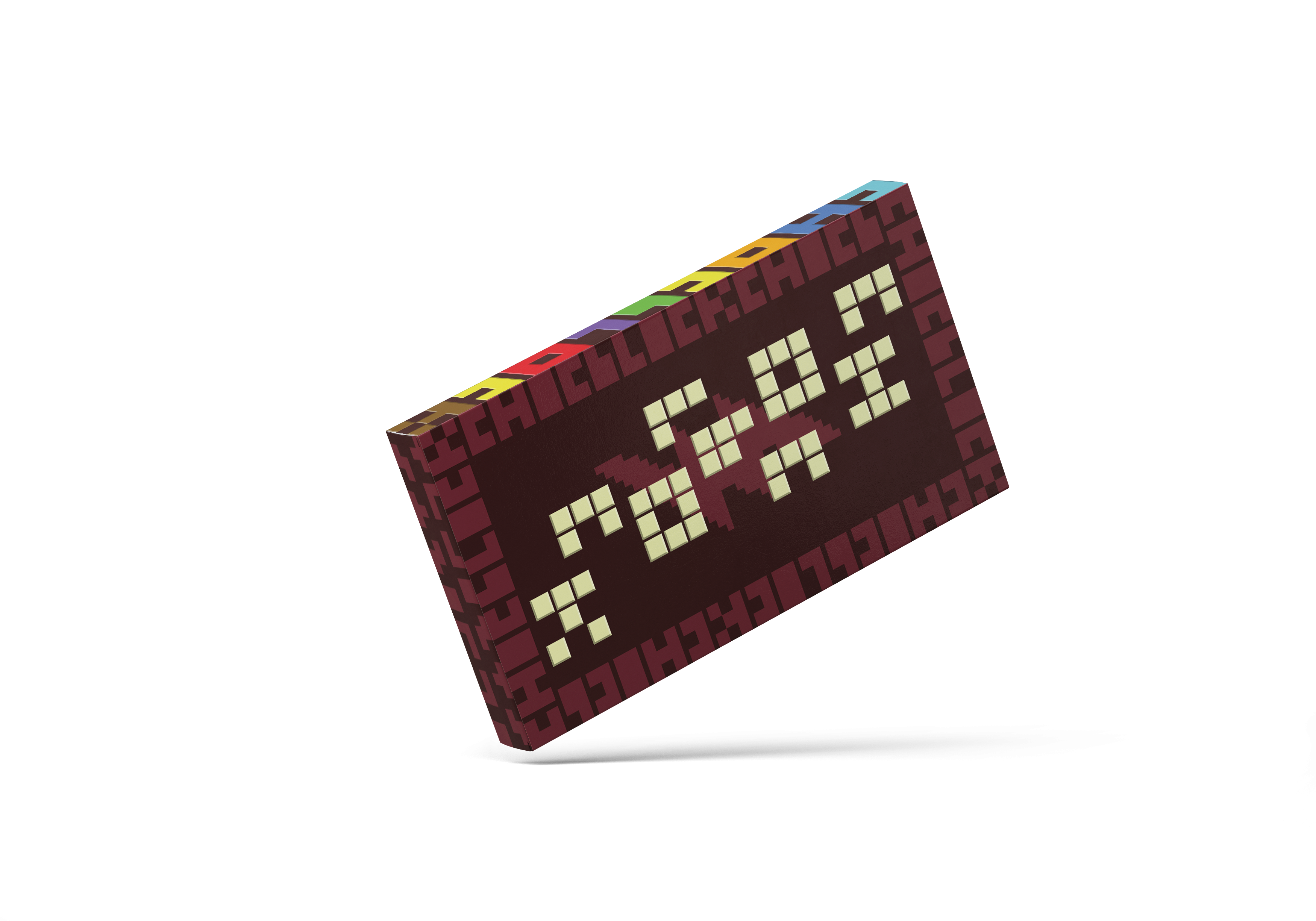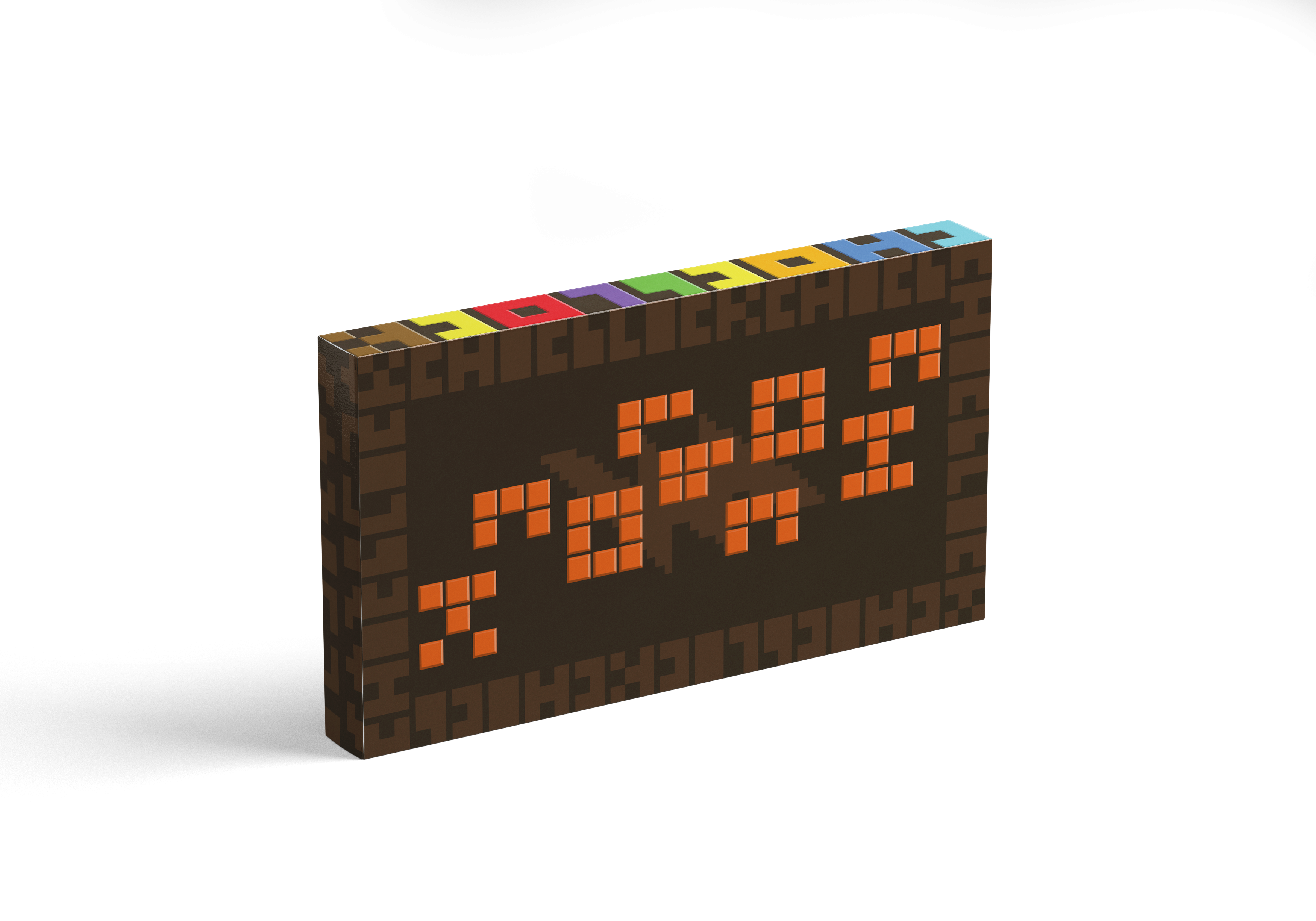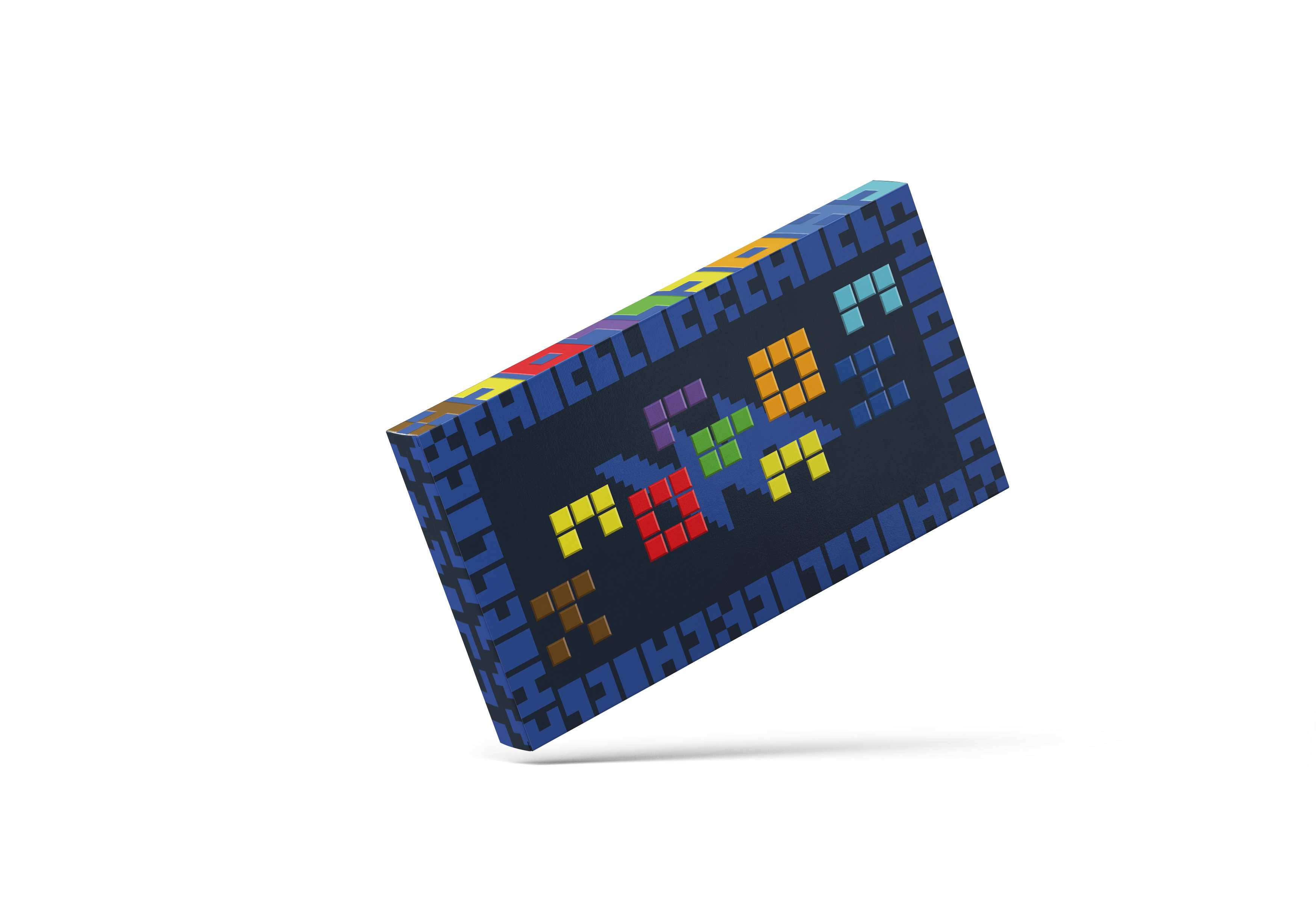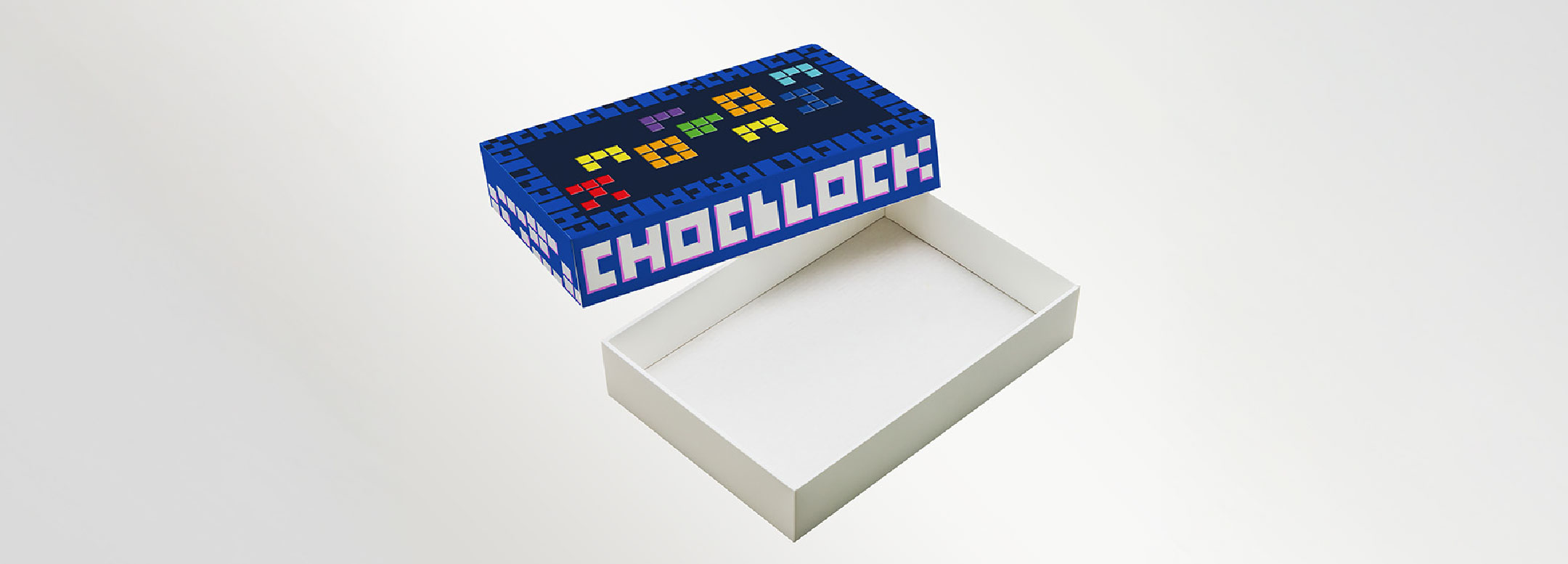 “Chocblock” is a packaging design for a chocolate brand inspired by Tetris. The packaging and logo use block-like elements combined with the classic Tetris color palette. The chocolate bars are divided into different flavors.