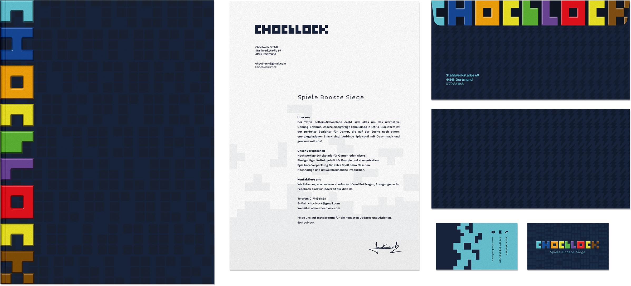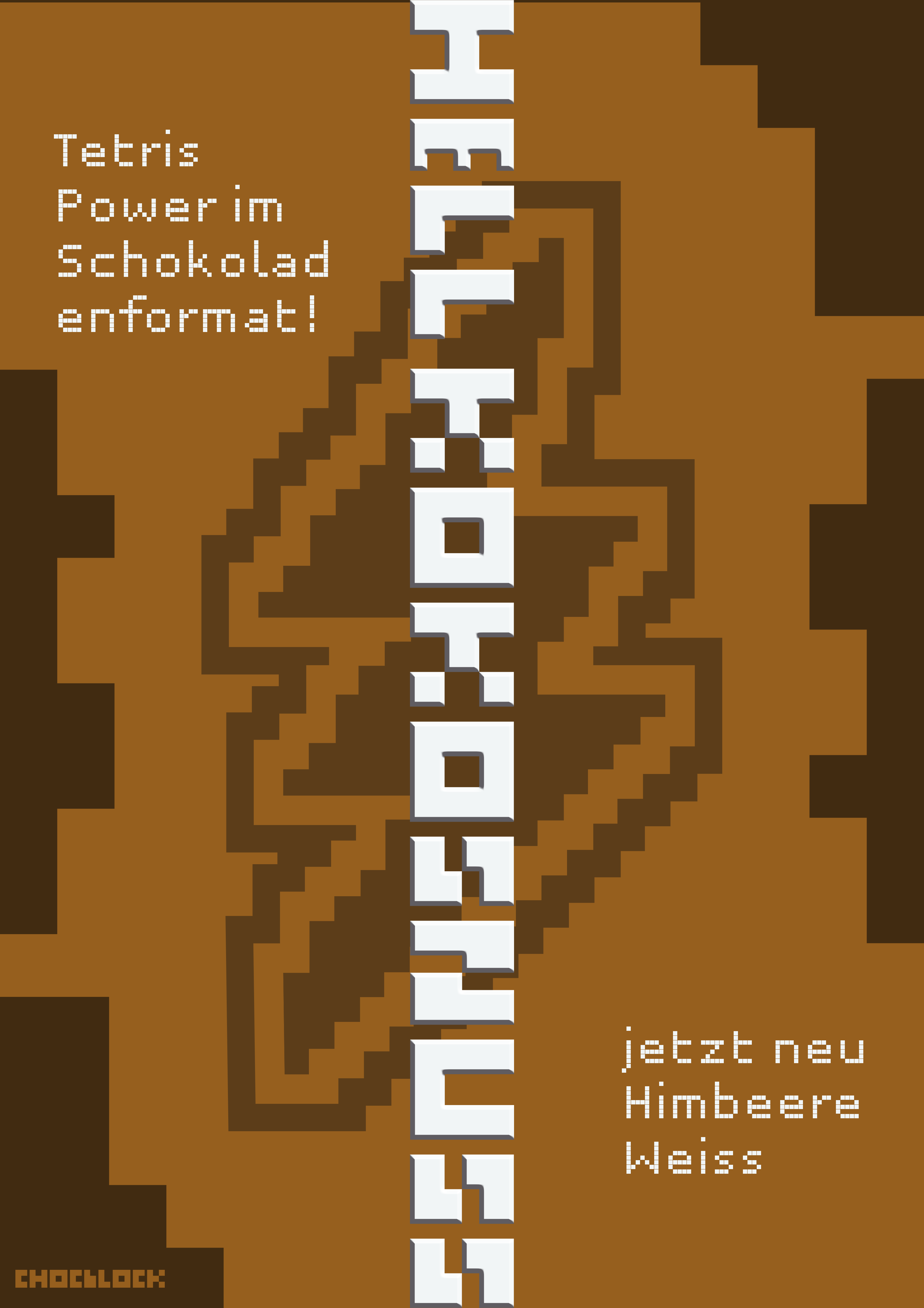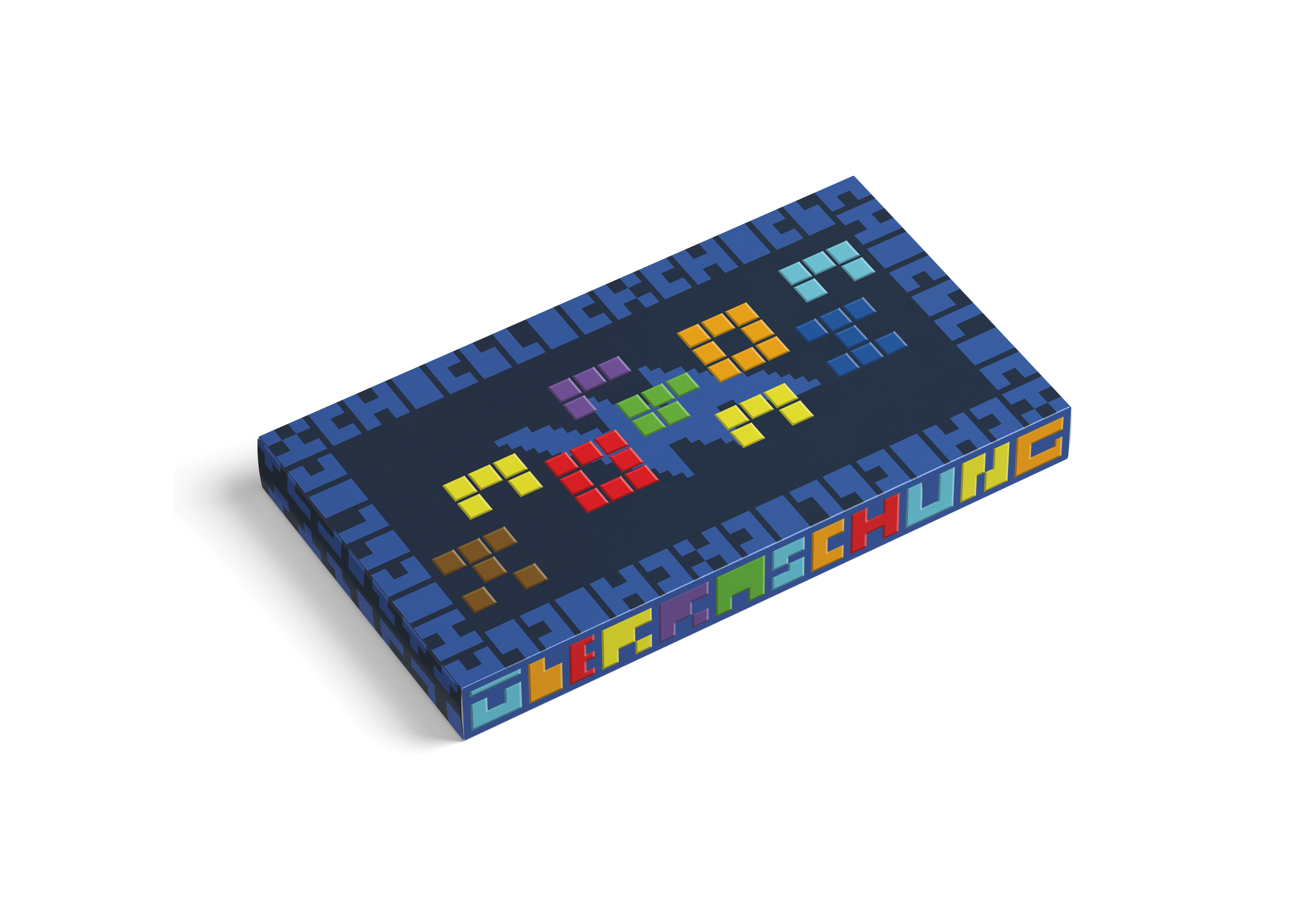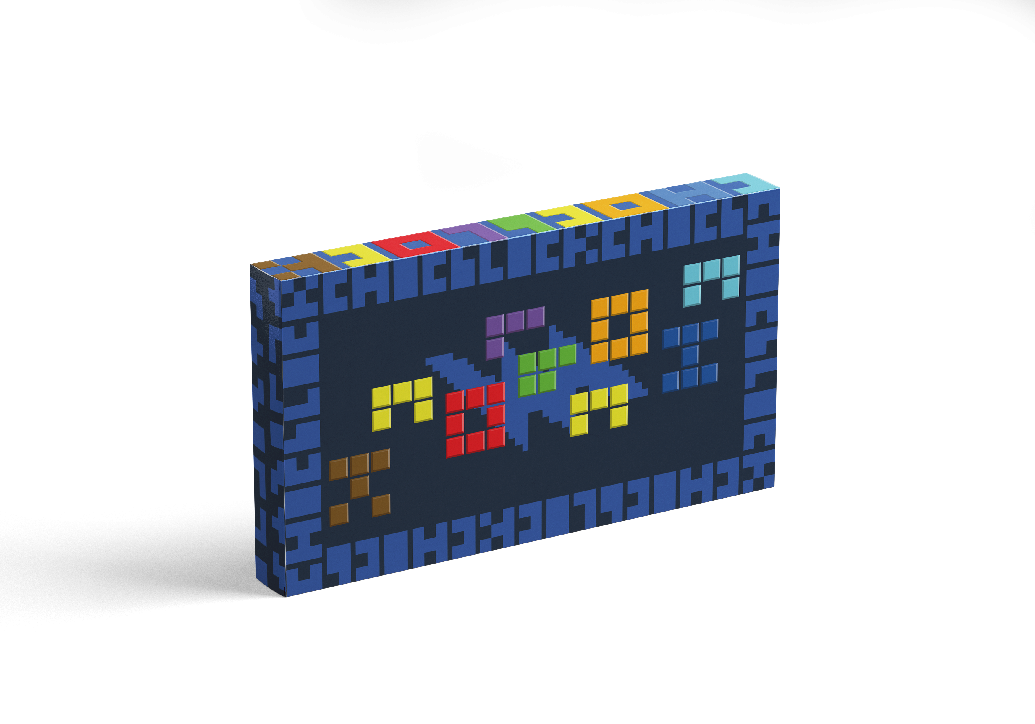 “Chocblock” is a packaging design for a chocolate brand inspired by Tetris. The packaging and logo use block-like elements combined with the classic Tetris color palette. The chocolate bars are divided into different flavors.