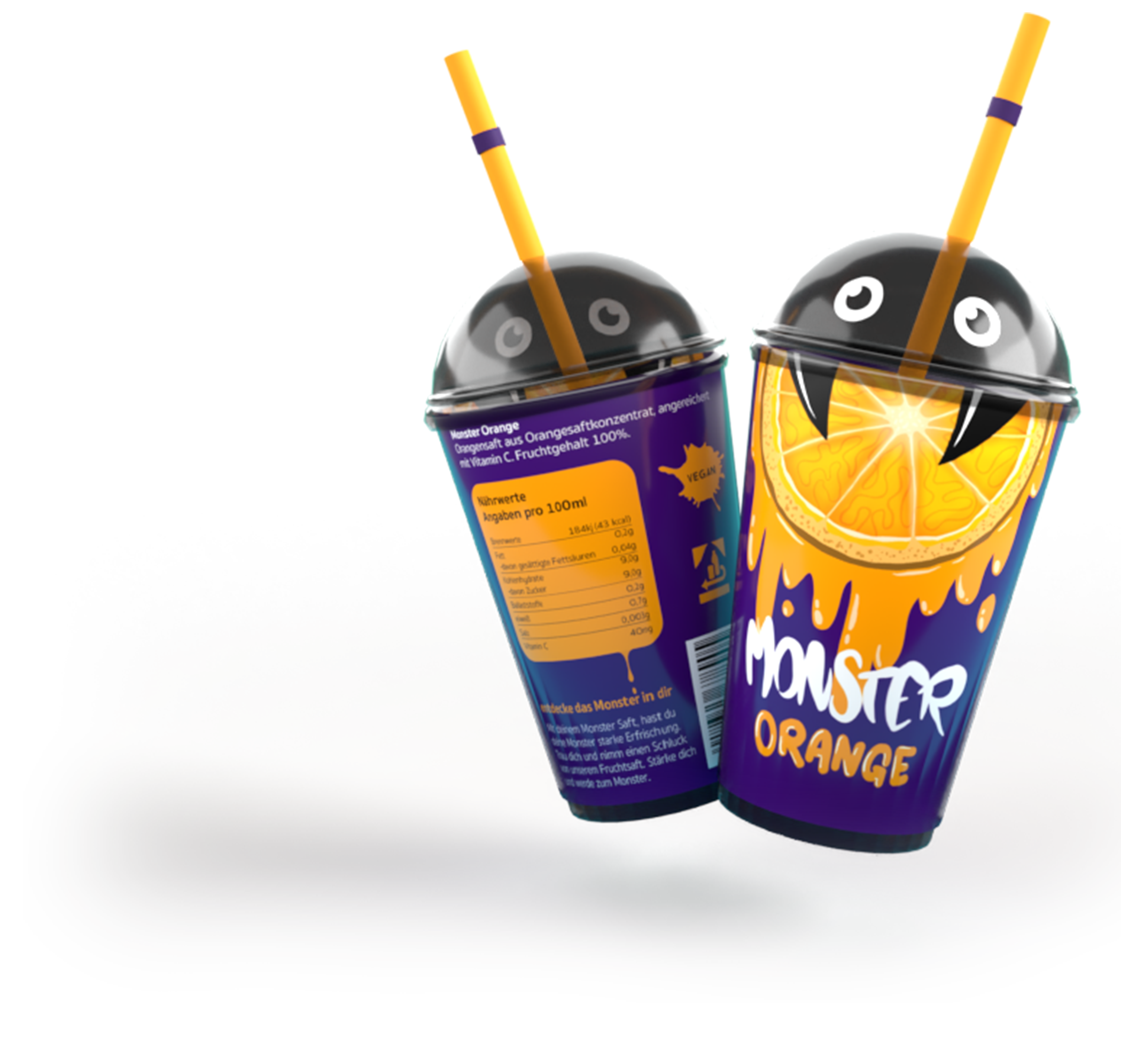 Nachdem die Form standskizzierte ich mehrere Designideen und entwickelte ein passendes Konzept. Schon beim Designer der Form ging ich spielerisch vor, dadurch kam ich auf die Idee ein Fruchtsaft für Kinder zu machen. Nach ein paar Skizzen kam mir die Idee eine Monster Serei zu erstellen und so ein aufregendes und Spielerisches Design für Kinder zu entwerfen.